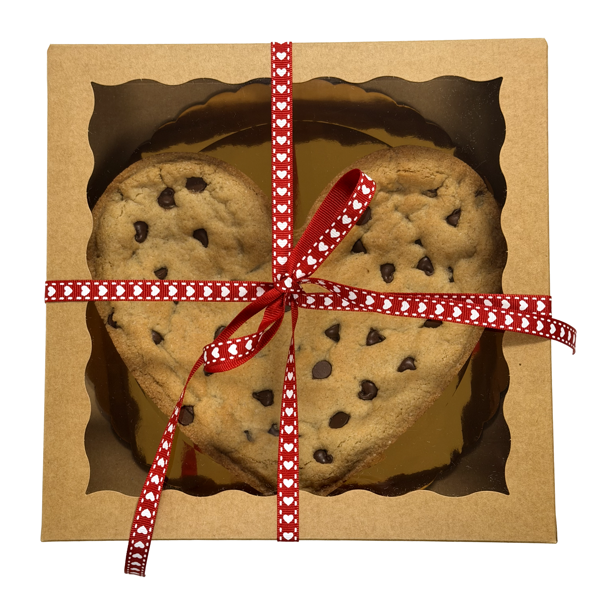 An 8-inch heart-shaped gluten-free chocolate chip cookie cake